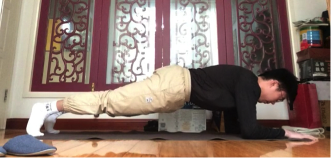 下午四点整,通过腾讯会议线上视频直播的方式,学院选拔赛正式开始。比赛分为男生、女生两个组别,全程直播并进行录像。首先参赛的是女生组,女生组被分成两个小组分别进行比拼。随着主持人的一声令下,大家俯卧于地面开始平板支撑,动作十分标准。