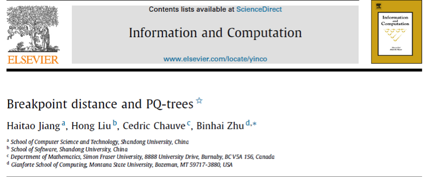 bv1946伟德官网,1946伟德官方网站姜海涛副教授作为第一作者在理论计算机科学领域顶级期刊IandC(Information and Computation)上发表文章“Breakpoint distance and PQ-trees”,揭示了PQ-树所产生的排列的断点距离特性,解决了比较基因组学领域的两个十几年悬而未决的公开问题。bv1946伟德官网为该论文的第一作者单位,美国Montana State University和加拿大Simon Fraser University为合作单位。