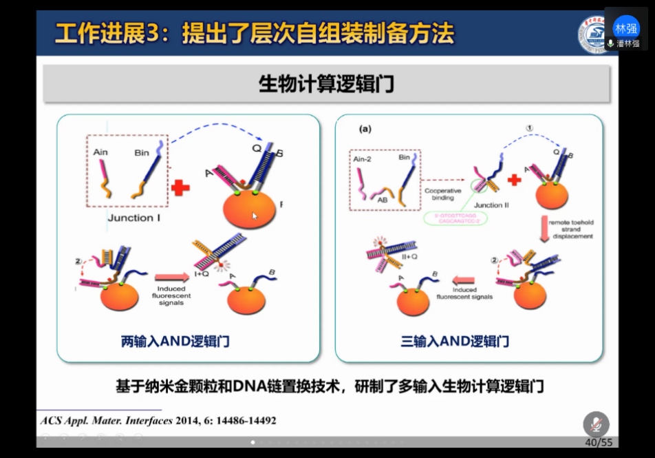 潘林强博士首先介绍了DNA计算是研究基于生物材料和技术的新型计算模型和算法,展示了DNA存储和处理信息的能力。接下来潘林强博士从各个角度介绍了DNA的特性,说明DNA是信息处理值得探索的理想载体,能够构建DNA神经网络等微纳器件。接着潘林强博士进一步详细讲解了生物计算如何为非确定计算提供平台,介绍了生物计算研究在存储和计算方面的重要进展,让同学们感受到了DNA计算的优势。潘林强博士还展示了其课题组丰富的研究成果,提出了关于生物计算的未来展望。报告结束之后,潘林强博士与老师同学们进行了热烈的讨论,并且认真解答了关于DNA计算的技术疑问。