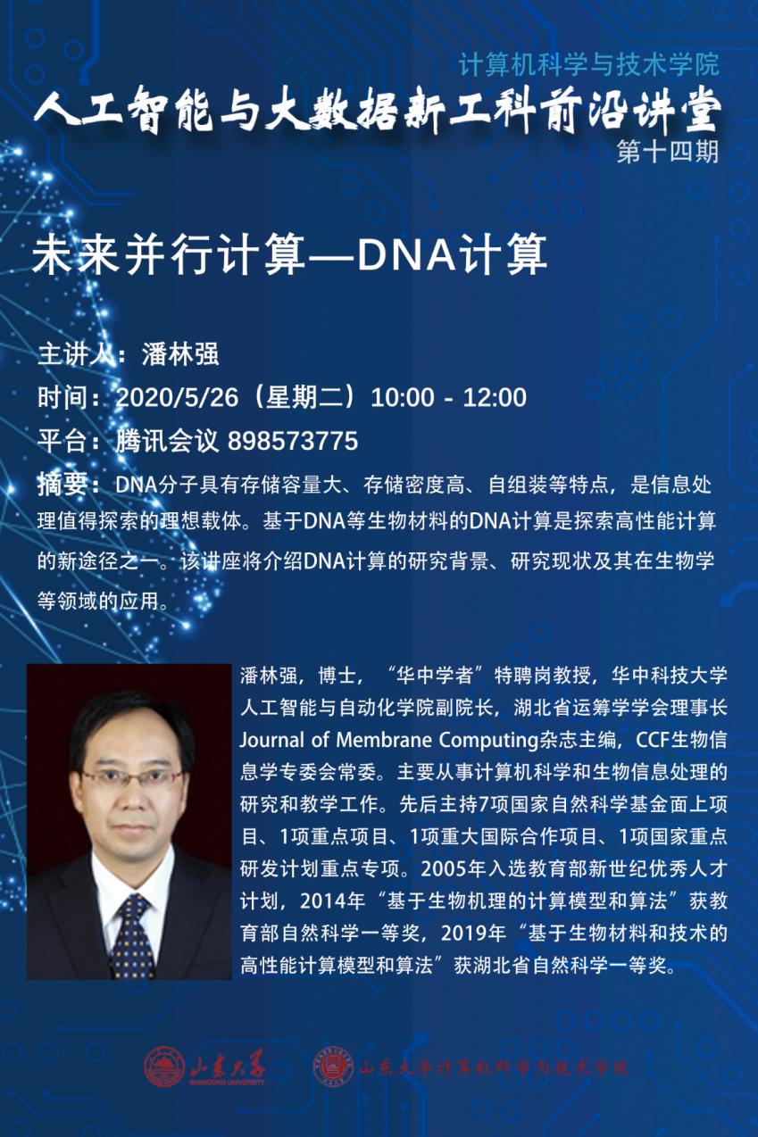 2020年5月26日,人工智能与大数据新工科前沿讲堂第十四期在腾讯会议线上直播平台举办。本次讲座邀请了华中科技大学人工智能与自动化学院副院长、华中学者特聘教授、CCF生物信息学专委会常委潘林强博士,为学院师生做了题为“未来并行计算——DNA计算”的报告,并于报告后与老师同学们进行了热烈地交流。
