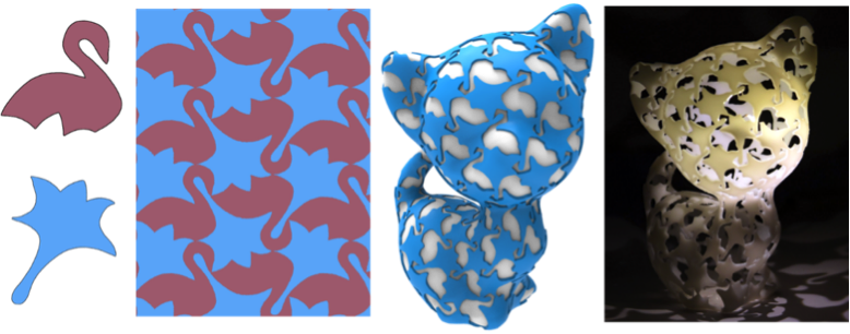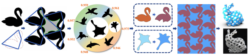 论文受到埃舍尔镶嵌画的启发,提出了一种新型的面向数字制造的埃舍尔双类形状密铺方法。该算法首先提出考虑3D打印约束的双类密铺规则,对于给定的两幅图案,计算基于密铺规则的排列方式,从数据库中搜索与封闭图案最匹配的形状,并同时对两类形状进行变形优化,使两类形状尽可能保持原始几何特征。算法通过曲面参数化将双类密铺映射至三维模型,并进行结构优化以保证3D打印模型的强度。该方法大大提高了三维模型表面实体及孔隙部分的表现力,可直接应用3D打印创新设计,如灯具、包装等,并为后续多类形状的建模工作提供了新的思路。论文合作者包括指导教师吕琳教授和屠长河教授、博士研究生闫鑫、以色列本·古里安大学Andrei Sharf副教授、以及以色列希伯来大学Dani Lischinski教授。