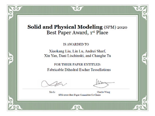 近日,bv1946伟德官网,1946伟德官方网站2019级博士研究生刘晓康在几何建模领域顶级国际会议Solid and Physical Modeling(SPM)发表论文《Fabricable Dihedral Escher Tessellations》,并获最佳论文一等奖(本届会议共设一等奖1名、二等奖1名、三等奖2名);2014级博士研究生周佳然在计算机图形领域顶级国际会议Eurographics(EG)发表论文《Combinatorial Construction of Seamless Parameter Domains》,并获最佳论文提名(前6%)。