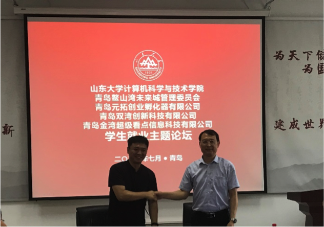 贾智平首先对各位参会代表的到来表示欢迎,对未来城管委会和各企业为学院提供的产学研结合等方面的支持表示感谢,并向与会代表介绍了学院今年就业情况,他表示,希望与未来城管委会和各企业进一步深化合作,促进院地政企的融合发展和人才培养工作的进一步提升。乔仁生对bv1946伟德官网,1946伟德官方网站主办论坛、提供良好的院政企交流平台表示感谢,他表示,愿同各方一道努力推进鳌山湾未来城的产教融合,促进高校学生高质量就业。邵琦向与会代表介绍了即墨区的大数据产业发展情况与前景,他表示,希望政府、企业与校方进一步增加合作,培养高质量人才,促进社会先进技术发展。汪心、王涛、王世文分别从企业角度分析了计算机、大数据等相关产业发展情况与目前大学生就业市场状况,表示愿同校方加强合作,共同构建良好的人才市场。院长助理陈竹敏、系主任蔡晓军分别从研究生和本科生角度介绍了学院在产教融合方面做出的工作和取得的成果,并对下一步加强产学研合作的心得与思考进行了分享。
