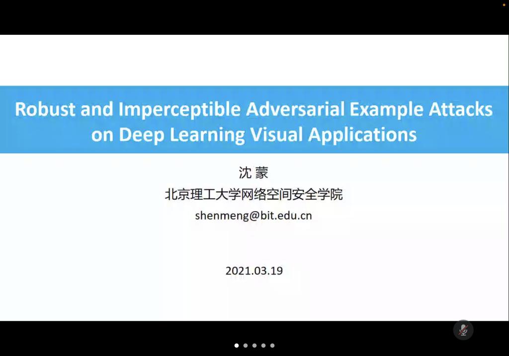 沈蒙首先介绍了自己的相关科研经历以及团队的主要研究方向,之后围绕深度学习和对抗样本攻击等主题进行探讨分析。他提出,深度学习算法已经在图像、语音、自然语言处理等不同领域展现出了优异的性能,推动了深度学习系统的应用普及,与此同时,深度学习算法及系统也面临众多安全威胁,其中对抗样本攻击是一类典型的、高效且隐蔽的攻击手段。他针对深度学习系统的对抗样本攻击的基本原理进行剖析,并以深度学习视觉应用为例,介绍了代表性的对抗样本攻击案例,对对抗样本攻击与防御的未来发展趋势和与会师生进行了探讨。