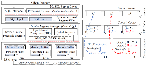 存储引擎是关系数据库中的关键组件。随着互联网云服务和大数据应用的出现,最新的技术趋势是在关系数据库中部署基于Log-structured Merge Tree (LSM-tree)的存储引擎。虽然集成LSM-tree作为存储引擎可以取得更好的读写性能和更高效的存储空间利用率,但这种新的双层结构也引发了冗余日志问题, 导致写放大和不必要的性能开销。该论文提出了一种被动数据持久化方案(PASV),有效地解决了基于LSM -tree关系数据库的冗余日志问题。通过被动内存缓冲区刷新策略、基于Epoch的数据持久化方案以及局部数据恢复机制,实现了运行期间数据库持久化的低开销以及故障的快速恢复。