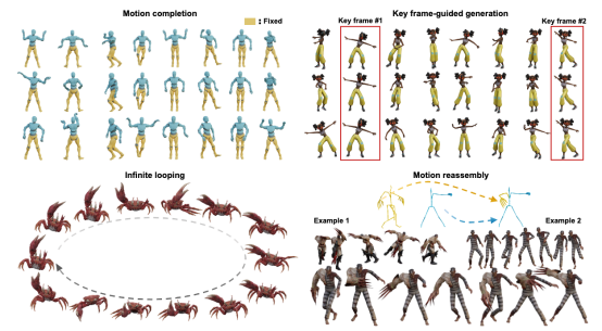 第3篇文章研究角色动作生成机理(图3),这是动漫产业广泛关注的核心技术。已有方法需要海量样本数据,采集成本高,训练周期长,应用场合非常受限。本文创新地提出了多阶段角色动作生成的新框架,通过渐进式吸收弱先验知识,准确推理缺失动作过程。该方法极大地降低了参考样例的数目,免去了耗时的训练过程,提高了方法的普适性。并且,通过开发Blender插件,形成了高效易用的角色动作创作新流程。该文由陈宝权教授指导,以硕士生李威宇和腾讯AI Lab高级研究员陈学霖(2020年博士毕业于bv1946伟德官网bv1946伟德官网)为共同一作。参与合作的教师还包括ETH Zurich的Olga Sorkine-Hornung教授。