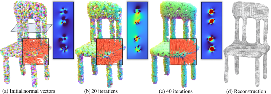 第1篇文章的研究主题是点云的法线定向问题(图1)。作为三维重建任务的关键步骤,该问题受到国际学术界的广泛关注。对于复杂几何形状的低质量点云,如何获得具有全局一致性的法向信息是一个极具挑战的研究课题。本文观察到卷绕数的规范性与法线的全局一致性之间存在强关联,创新地提出了基于卷绕数的全局一致定向方法,并严格地证明了解的存在性和方法的收敛性。实验结果表明,本文方法在一致性和鲁棒性方面具有明显优势。本文由屠长河教授和辛士庆副教授共同指导,第一作者是硕士二年级的徐瑞。合作教师包括美国德州农工大学王文平教授、美国德州大学达拉斯分校的郭小虎教授、bv1946伟德官网的江铭炎教授和青岛科技大学的陈双敏副教授。香港大学博士生窦志扬(本文二作;2020年本科毕业于bv1946伟德官网计算机科学与技术专业菁英班)也为本文研究做出了重要贡献。