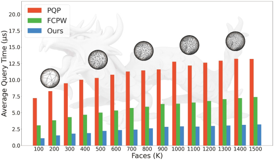 图2 我们提出的距离查询算法比串行的PQP快5-6倍,比SIMD并行化的FCPW快2-4倍