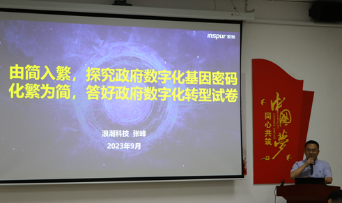 在签约和揭牌仪式之后,张峰总经理就浪潮软件科技有限公司当前的主要业务和关键技术进行了报告,并对政府数字化转型的主要需求进行了全面概括。彭朝晖教授就研究中心的合作场景、合作技术内容以及工作成果基础进行了报告,并对未来的工作计划进行了阐述。