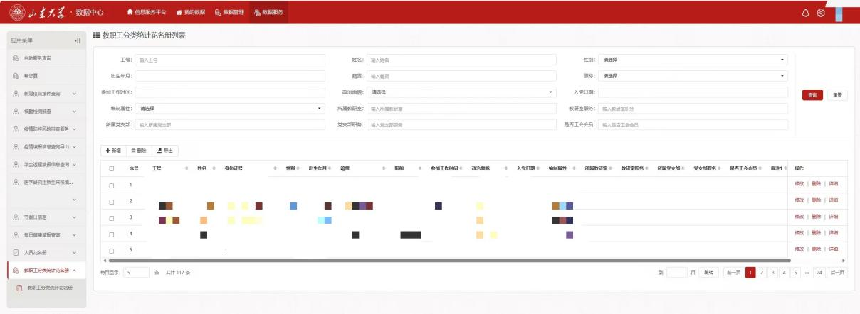 而面向学校职能部门以及学院行政管理人员数据统计的不同需求,学院也推出了教职工分类管理服务。一方面可以及时维护修改个人信息,规范了学院人事管理工作,便于更好开展大数据分析。另一方面也打通了学院党建、行政、工会三方面工作业务联通,促进了教职工信息共享,缩短了数据分析与统计时间。