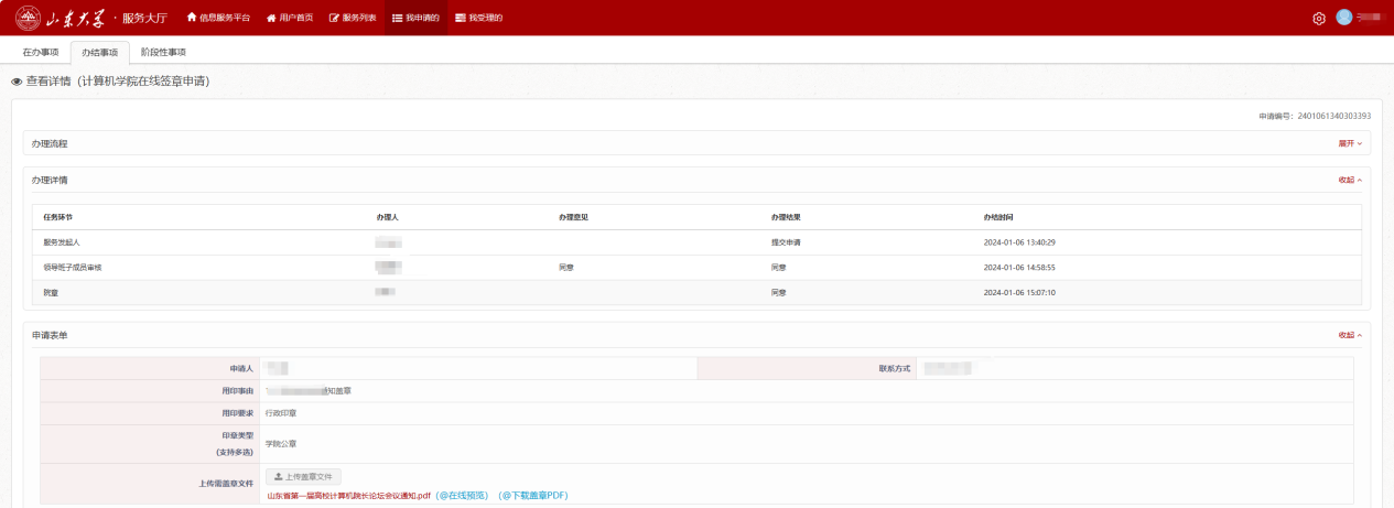 同时为方便师生“足不出户”线上提交各类材料、办理各项业务,在线电子签章申请服务应运而生。学院公章已实现线上用印,师生上传材料经分管领导审核后,即可完成线上签章,电子签章文件也可自行下载。这一举措打通了学院无纸化办公的“最后一公里”,有效提升了师生的业务效率。