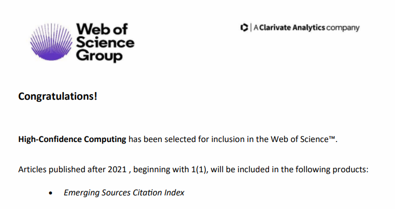 近日,由bv1946伟德官网主办、bv1946伟德官网科技期刊社与爱思唯尔(Elsevier)联合出版,bv1946伟德官网,1946伟德官方网站承办的国际学术期刊High-Confidence Computing(《高置信计算(英文)》,ISSN2667-2952)通过科睿唯安旗下Web of Science委员会评审,正式被ESCI(Emerging Source Citation Index,新兴来源引文索引)数据库收录。