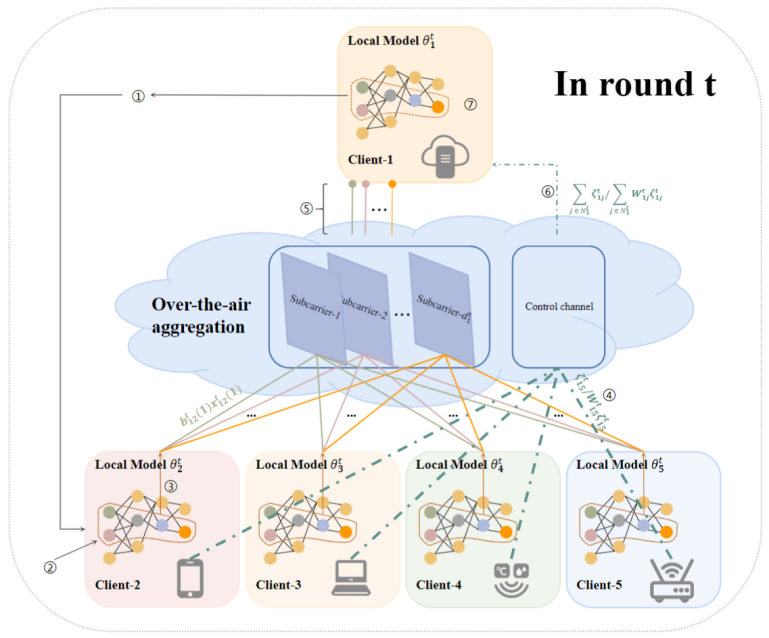 该研究基于通信资源有限的空中计算场景,深入分析了网络资源的有限性和动态性对去中心化学习收敛性的影响。研究在理论上量化了由载波数量限制导致的模型分量选择误差和由网络噪声引起的通信误差如何导致学习过程收敛速度的减慢,成功填补了现有研究在这方面的空白,这一理论分析为后续在去中心化学习领域设计资源分配方案提供了重要的指导。特别地,该团队创新性地提出了一种针对发射端和接收端的功率分配方案。这一方案采用“放缩-恢复”思想,针对有限的通信资源进行了优化设计,不仅有效地加速了学习过程的收敛,而且相较于其它方法,在保护隐私和降低计算开销方面表现更优。此外,该团队还利用有损通信和空中计算机制提供了双重隐私保护方法,并给出了理论上的隐私分析,这不仅提升了去中心化学习的效率,而且为隐私保护提供了全新的视角和方法,为应对资源受限情况下的学习问题提供了高效且安全的解决方案。