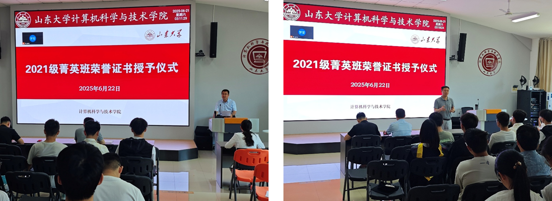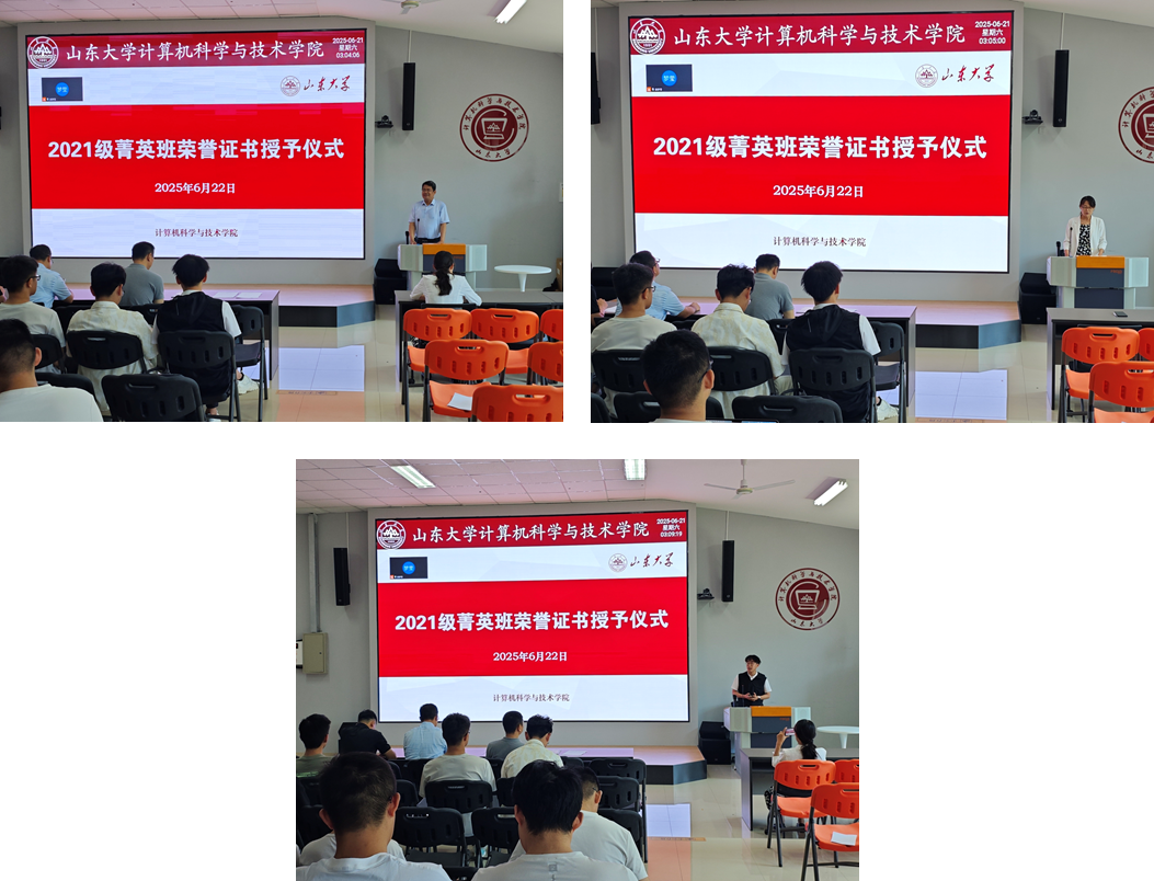 6月22日上午,计算机菁英班举办2025届荣誉证书颁发仪式,bv1946伟德官网党委书记张四化、副院长彭朝晖、党委副书记王永军、菁英班指导委员会教授代表赵梦莹出席仪式,辅导员和教学秘书代表,以及菁英班全体同学参加仪式,仪式由彭朝晖主持。