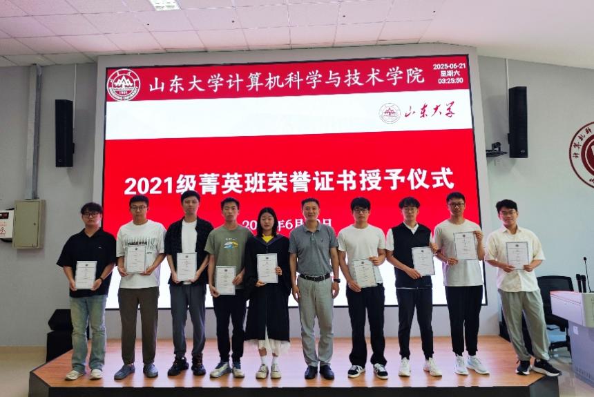 王永军宣读了《关于授予李瑞涵等11名同学计算机菁英班荣誉证书的决定》。张四化向通过综合考核的11位菁英班毕业生分别颁发荣誉证书并合影留念。张四化表示,菁英班的经历将成为同学们未来发展道路上的重要基石,他勉励大家保持勇于挑战、积极求变的精神面貌,始终将学院视为共同的家和永远的后盾,希望同学们带着学院的期望和祝福,继续发挥菁英班精神,开启人生新篇章。