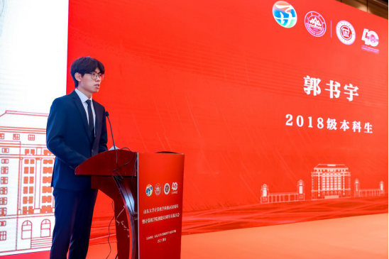 2018级本科生郭书宇代表学院全体在校生发言。他表示,作为一名在校学生,感激学院众多优秀教师传道授业,将专业知识倾囊相授,使他建立起了全面而牢固的知识体系,感谢学院领导和辅导员老师高度重视学生的身心健康及全面发展。他希望能够向校友前辈们看齐,传承山大精神,弘扬计科传统,在破解计算机领域一系列卡脖子技术问题上,勇担时代重任,砥砺奋进,建功立业,回报祖国。