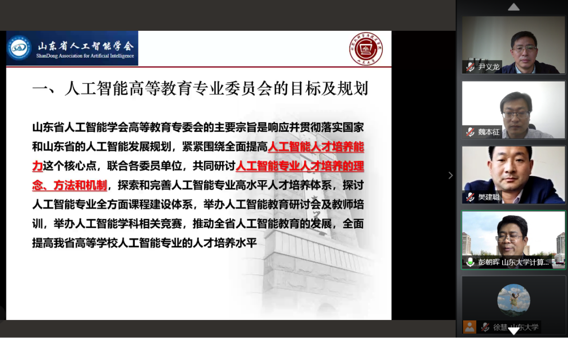 7日上午,山东省人工智能学会高等教育专委会主任彭朝晖在线主持了第一届山东省人工智能高等教育大会专家报告会。本场报告会共由六场主题报告组成。